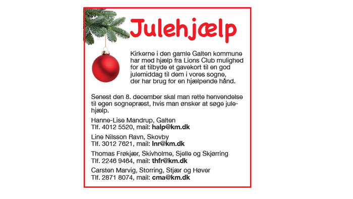 Lions Club og kirkerne er gået sammen om at tilbyde et gavekort til en julemiddag til de i sognene, som har brug for en hjælpende hånd.